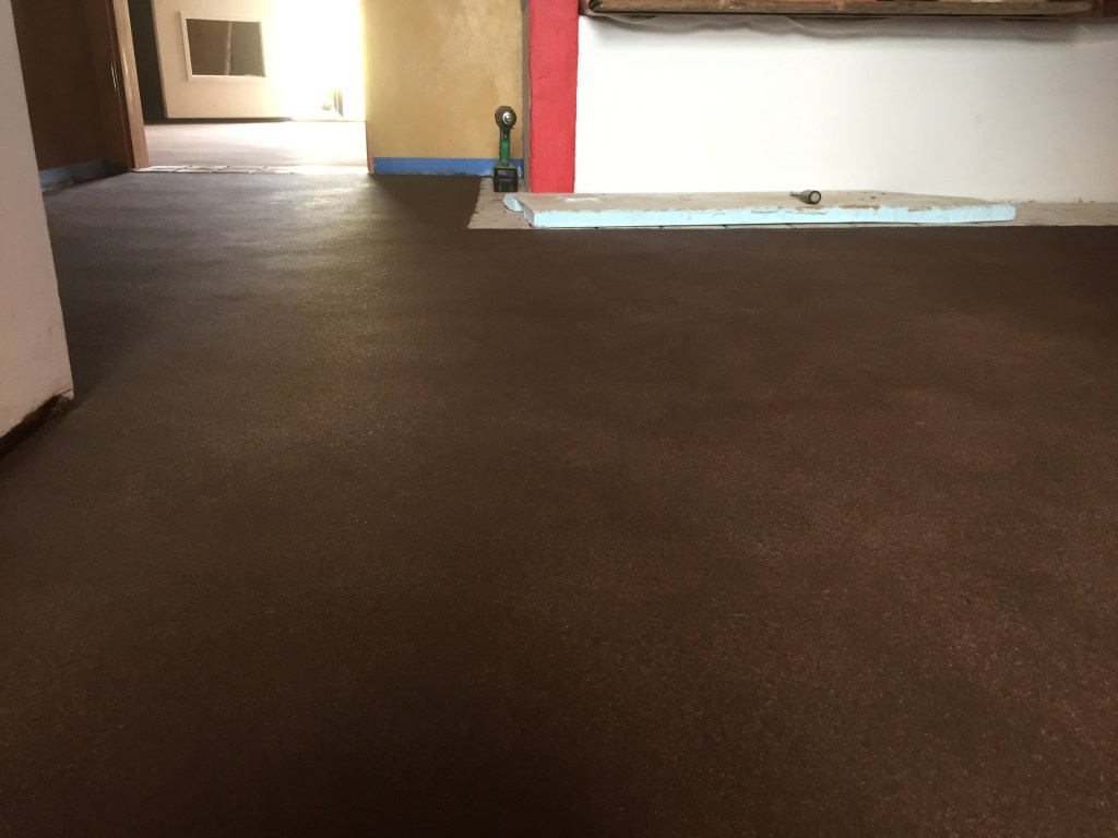 Compared to installing the floor material and hard-troweling it afterward, applying the layers of linseed oil with paint brushes was so easy and quick! We did about 4-6 coats of linseed oil in each room. We’d start with two coats of 100% linseed oil and then cut it to 50% linseed oil/50% mineral spirits for the rest of the coats. We never found it necessary to increase the percentage of mineral spirits beyond 50%. The linseed oil darkens the floor considerably and makes the floor surface a little harder.