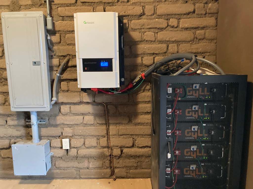 And then there are the components of the system on the inside of the house. In the photo below, we see the main electrical panel, the inverter, and the LiFePo batteries.